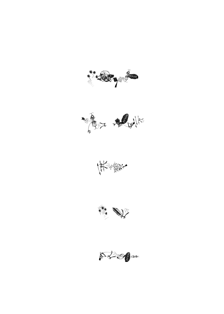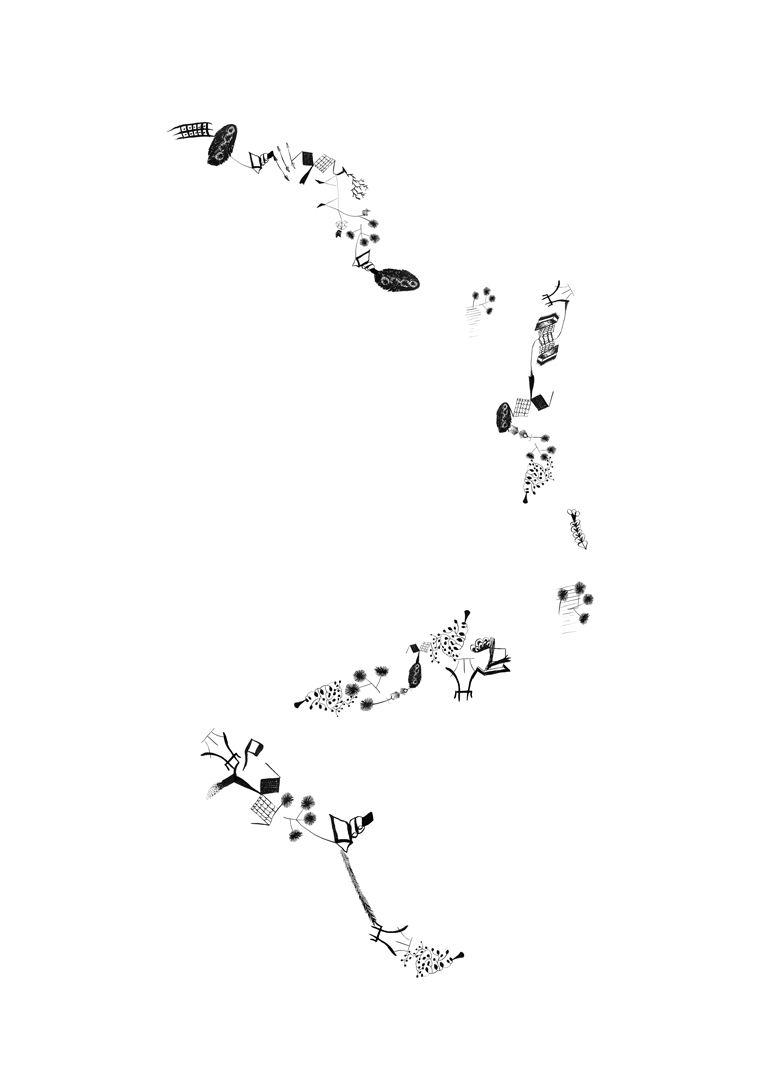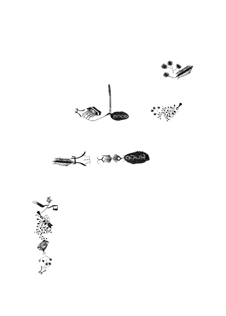 El movimiento de Lucas Di Pascuale sobre el lienzo rescata elementos del paisaje autóctono para fundar una grafía ideogramática. Su eco reverbera hacia otra dimensión completamente diferente a la del original y se inscribe entre líneas. Desde los márgenes de los diferentes discursos, ahonda en lo inconmensurable para envolver el libro subrayado entre pliegues y capas de sentido. Extrae frases alrededor de las cuales dibuja formas derivadas tanto de la vegetación que lo rodea como de fantasías, improvisando un nuevo alfabeto que vacila entre la materialidad y la inteligibilidad. Su bosque idiomático no le hace sombra a la voz del otro sino que deja caer en toda su plenitud sobre éste las hojas del lenguaje puro, apenas un balbuceo, resonancias de lalangue.