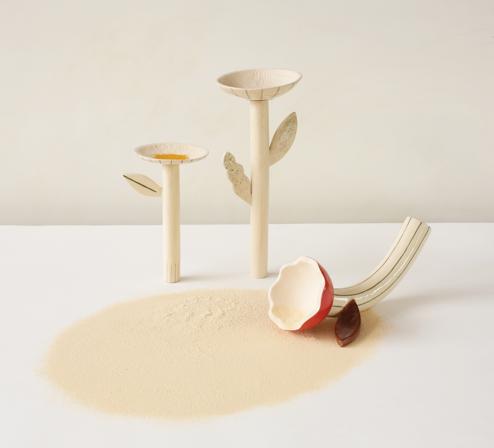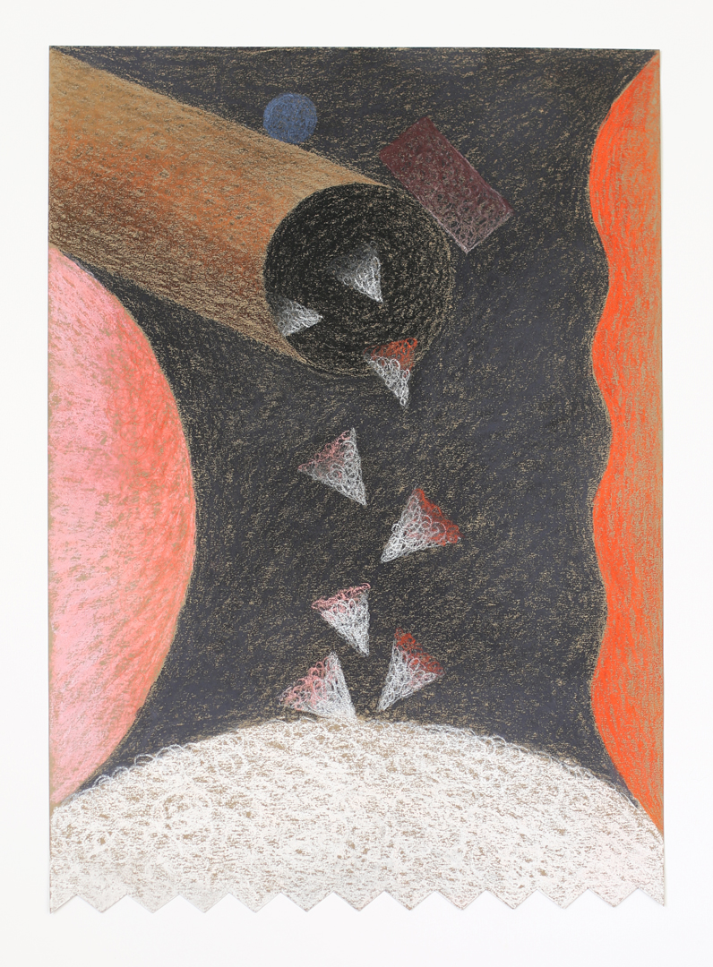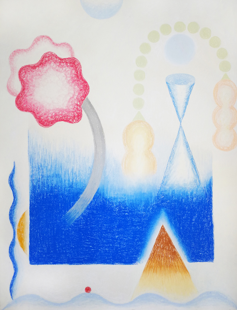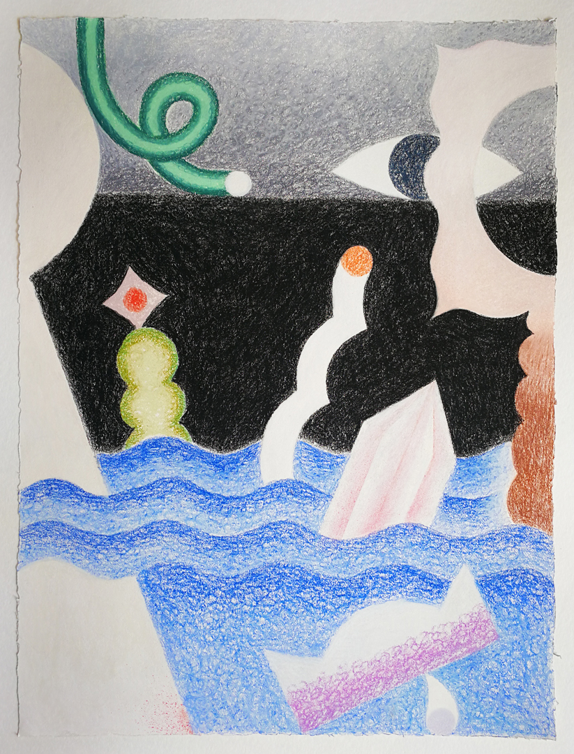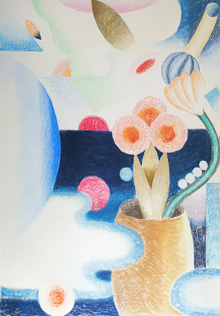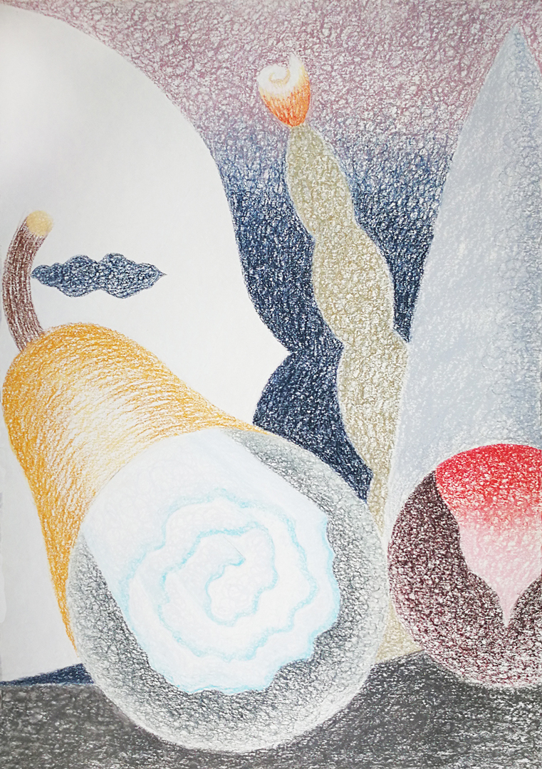 Los espacios vacíos dejados por el blanco del papel contrastan con planos de color intenso cuyas capas prometen una profundidad que desafían. Margaritas con tallos ondulantes, jarrones de cerámica, cuentas de collar simil gusano, formas oculares que se van por las ramas y otros elementos que infringen lo gravitatorio de un modo tan lúdico como inverosímil. Se trata de morfologías que escapan al sentido y al pragmatismo de lo utilitario. Se escurren o se quiebran para convertirse en otra cosa, diluyéndose en formas abstractas y pigmentos. Estas criaturas, acéfalas y carentes de extremidades (ni piernas ni brazos), son por completo intimidades. Sus formas van de lo geométrico a lo redondeado con cierta ambivalencia. Incluso las cerámicas, cuya arcilla proviene de lo profundo de la tierra, se alejan sinuosas, zigzagueando como serpientes, rumbo a lo desconocido. Sus cuerpos tentaculares con reminiscencias botánicas alteran la experiencia que tenemos de aquello que integra nuestra vida cotidiana. Pese a ser familiarmente inquietantes, contrario a lo unheimlich, no son sin embargo aterradores: adquieren su belleza en el devenir otro.